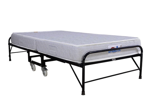 Wrought Iron Metal Folding Single Bed with 6-Inch Contemporary Premium Mattress, Lockable Wheels